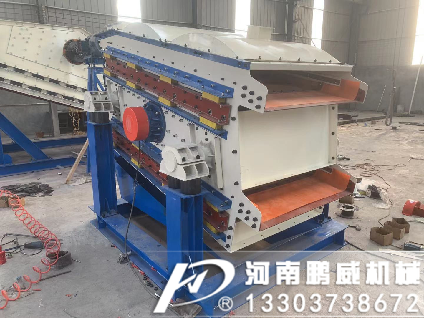 采用雙組側板電機激振器由偏心塊同步旋轉共振帶動彈性聚氨酯篩板產生波浪弛張振動的圓彈躍運動和直線彈躍運動,篩面傾角一般為15-25°篩板由兩端活動梁固定,配合剪切彈簧和板簧產生高振幅振動達到固定橫梁和活動橫梁對篩網的慣性力矩不斷地張弛形成一凹一凸的波浪效果達到物料良好的松散流動性同時獲得有效的物料彈躍篩分,實現篩分精度,篩分產量和防堵網的效果。