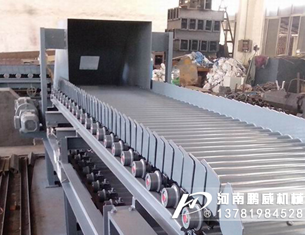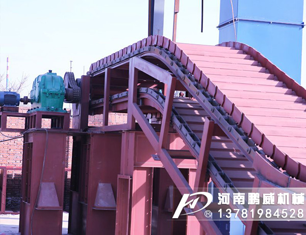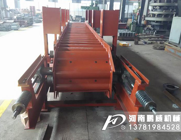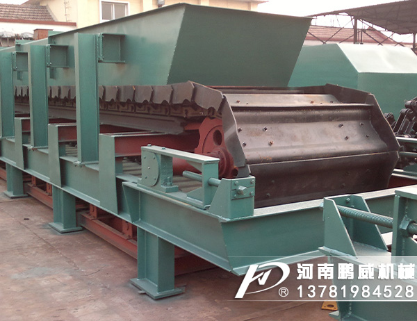 重型板式給料機(jī)是將電動(dòng)機(jī)的動(dòng)力,經(jīng)過聯(lián)軸器和減速器驅(qū)動(dòng)鏈輪軸旋轉(zhuǎn),通過鏈輪齒與鏈條銷軸嚙合,拖動(dòng)鏈板作連續(xù)直線運(yùn)動(dòng),鏈板由安裝在機(jī)架上的支重輪和鏈輪支承,并通過調(diào)整拉緊裝置使其鏈條與鏈輪正確嚙合,完成輸送給料之目的。