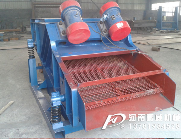 主要由篩箱、激振器、支承系統(tǒng)及電機(jī)組成。兩個(gè)互不聯(lián)系的振動器作同步反向運(yùn)轉(zhuǎn),兩組偏心質(zhì)量產(chǎn)生的離心力沿振動方向的分力疊加,反向離心抵消,從而形成單一的沿振動方向的激振動,使篩箱做作往復(fù)直線運(yùn)動。