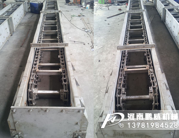 刮板輸送機的工作原理是,將敞開的溜槽,作為煤炭、矸石或物料等的承受件,將刮板固定在鏈條上(組成刮板鏈),作為牽引構件。當機頭傳動部啟動后,帶動機頭軸上的鏈輪旋轉,使刮板鏈循環運行帶動物料沿著溜槽移動,直至到機頭部卸載。刮板鏈繞過鏈輪作無級閉合循環運行,完成物料的輸送。